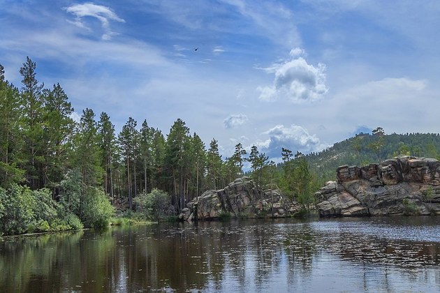 Озеро с сумрачными водами окружено полуразрушенными гранитными «слоеными» скалами и навевает ужас на жителей окрестных поселений.