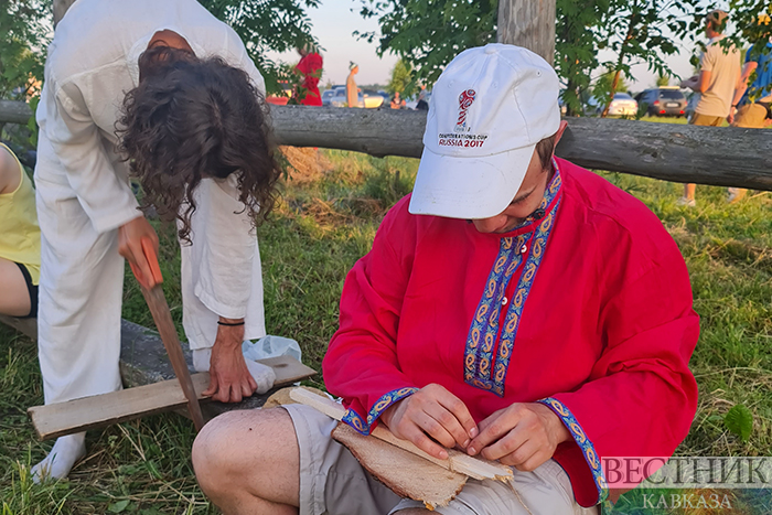 На торжке тем временем торговля шла все бойче, организовались игры и забавы. Две команды из равного числа молодцев и девиц соревновались в силе, ловкости, слаженности в движениях. У турника немолодой мужчина давал мастер-класс по боксу, а на окраине у околицы – метание ножей и копий, стрельба из лука. А у ряда "дачных скворечников" разместилась мобильная баня – на вид обычные большие палатки с трубами. Большого ажиотажа около них не наблюдал, но отбить организацию праздника точно помогают. Дети крутились вокруг сеновала, гулливерских качелей из половины бревна и двух батутов с надувным замком.