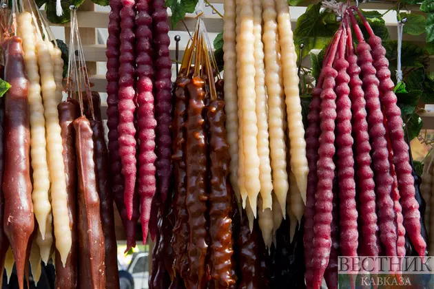 - Чурчхела: Густой виноградный сок обволакивает целые грецкие орехи, создавая длинные сладкие "колбаски". Это лакомство популярно в Дагестане, Чечне и Осетии. Чурчхелу сушат на солнце или в тени, и она хранится месяцами, становясь идеальным перекусом для пастухов и путешественников.