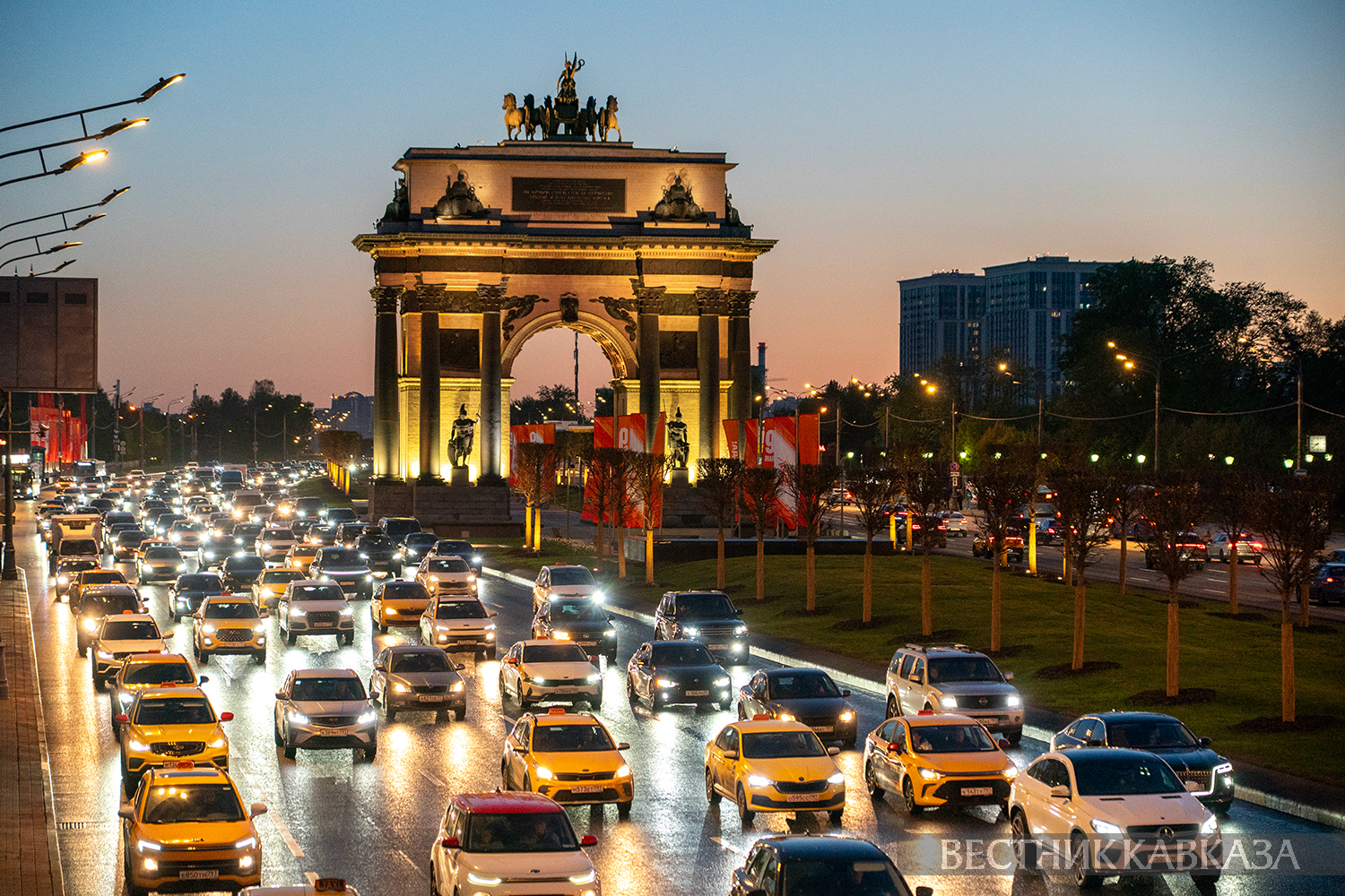 © Фото: Мария Новоселова/ “Вестник Кавказа“. Праздничное оформление ко Дню Победы возле Триумфальной арки на Кутузовском проспекте