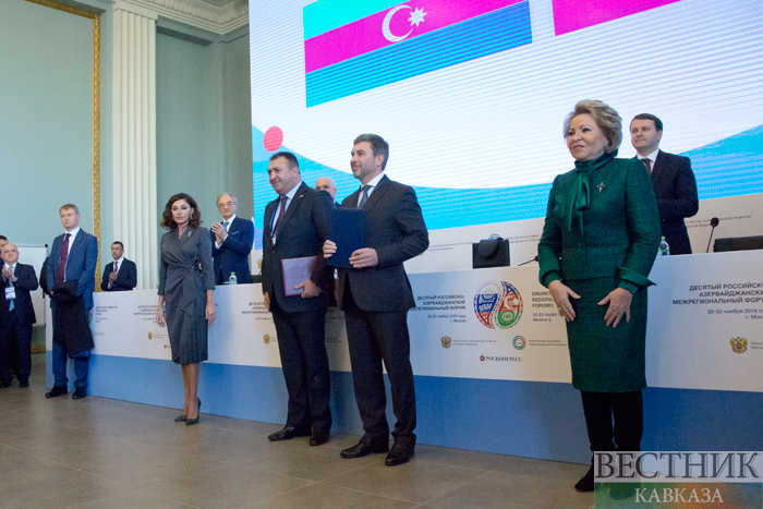 Напомним, X Российско-Азербайджанский межрегиональный форум проходит 22-23 ноября в Москве при организации Министерства экономического развития РФ и Министерства экономики АР. В форуме участвуют первый вице-президент Азербайджана Мехрибан Алиева, председатель Совета Федерации Валентина Матвиенко, главы экономических ведомств России и Азербайджана Максим Орешкин и Микаил Джаббаров, российские губернаторы и главы исполнительной власти городов и районов АР, представители бизнеса обеих стран.