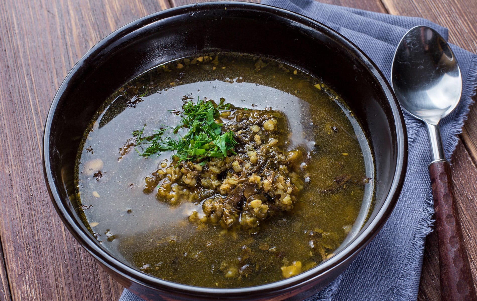 Густой, жирный суп следует приправить мелко нарезанным чесноком, добавить соль и перец по вкусу. Подают блюдо очень горячим и рекомендуют покрошить в него сухой лаваш, который впитает в себя густой бульон.