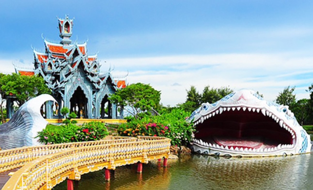 Парк Муанг Боран (или "Древний Сиам") – один из самых больших в мире музеев под открытым небом. Его площадь занимает 120 гектаров. На территории парка расположено более 100 мини-копий известных тайских храмов и других достопримечательностей. Причем все эти миниатюры размещены в соответствии с их географическим положением реальных зданий. Помимо копий есть и настоящие здания, которые были перевезены на территорию парка. Множество скульптур мифологических животных, фонтан в виде многоголовых драконов – это лишь часть фантастических сюжетов, которые можно увидеть в Муанг Боране. Так как всю территорию музея обойти нереально, в стоимость входного билета включен прокат велосипедов. Также посмотреть парк можно, арендовав электромобиль или же взяв экскурсию на специальном трамвайчике.