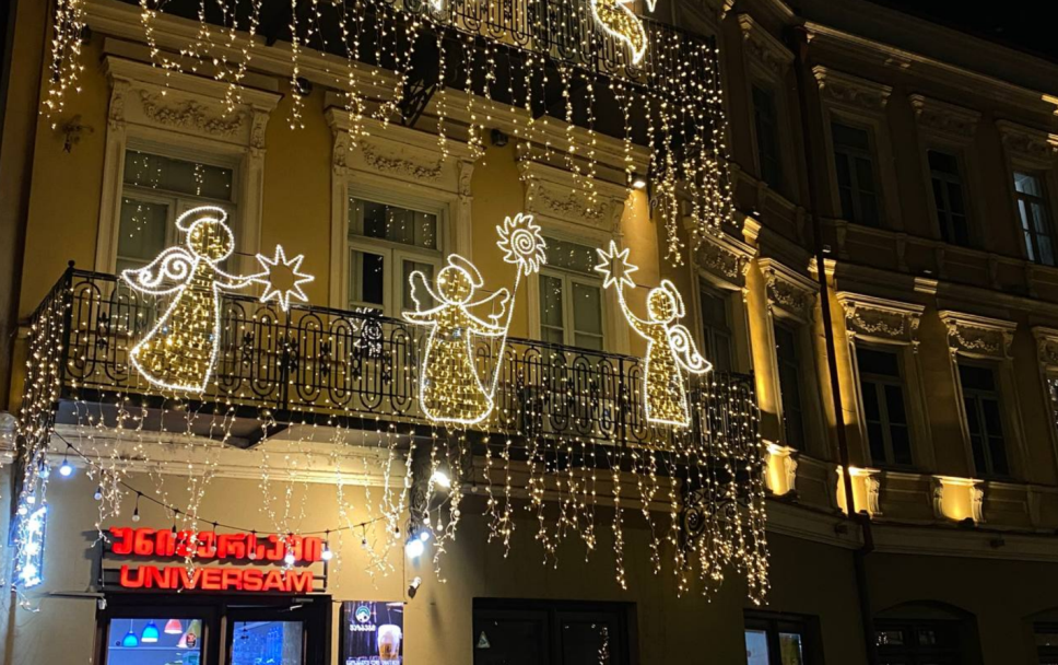 Вся площадь и прилегающие к ней улицы в яркой нарядной новогодней иллюминации – это светящиеся ангелы, новогодние подарки и другие символы наступающих Нового года и Рождества. Яркие украшения висят и на деревьях. В целом на площади Ореблиани царит атмосфера праздника и веселья, несмотря на протесты, которые проходят буквально на соседней улице.